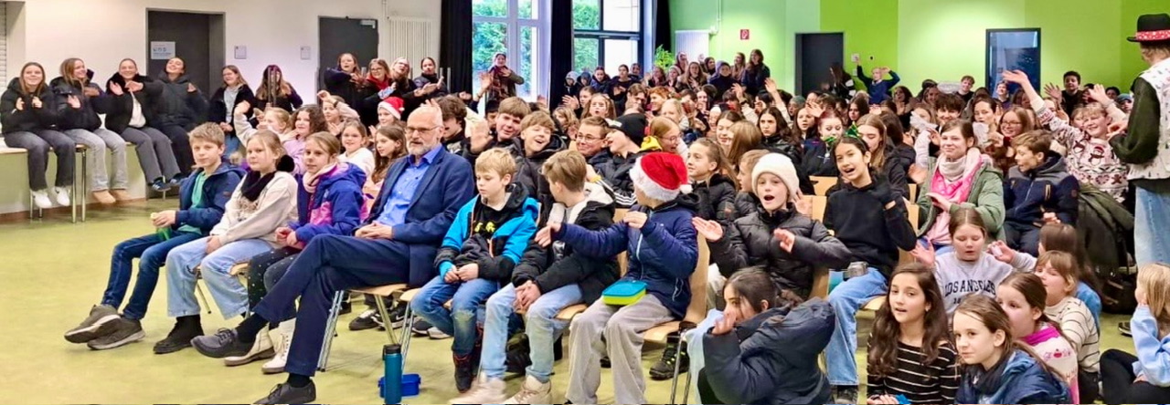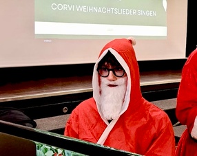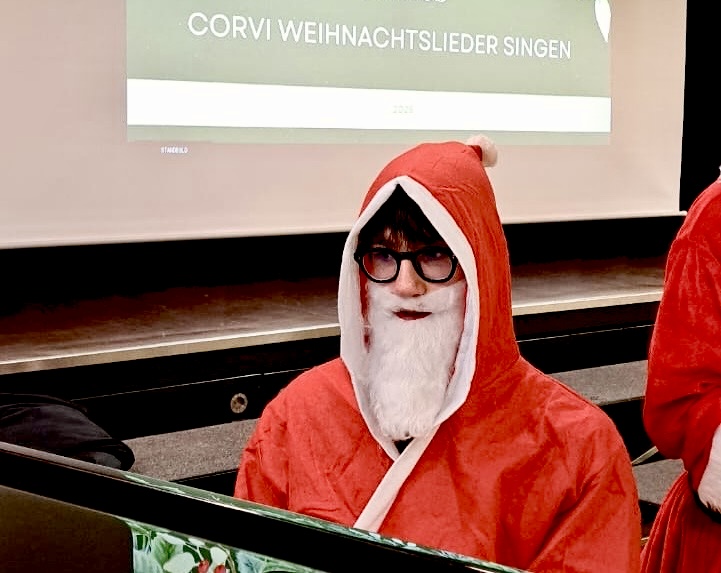 Julius begleitete am Klavier gewohnt gekonnt und saisonal passend kostümiert drei klassische Weihnachtslieder, anschließend wurde inbrünstig zu Liedern aus der Anlage gesungen. Vielen Dank an Theresa Meier mit ihrem Seminarfach für die Vorbereitung inklusive Stühlerücken, Julius für die Livemusik und Klangtechniker Dirk Diers für den satten Sound. Das war mal lit!