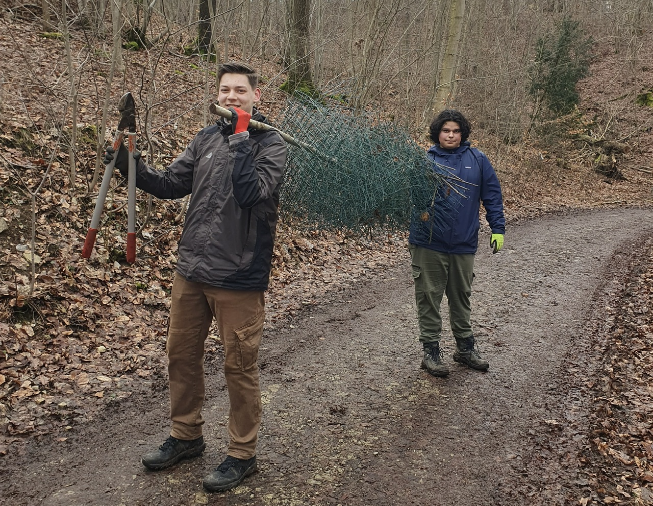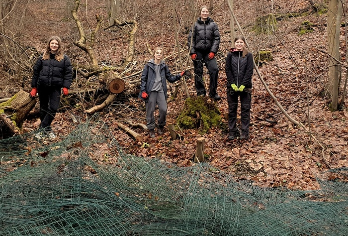 Darüber hinaus kümmerten wir uns um alte Drahthosen oder Kunststoffwuchshüllen, die vor einigen Jahren zum Schutz der jungen Bäume angebracht worden waren. Da die Bäume, die einst unter anderem von Schüler:innen des Corvinianum gepflanzt wurden, gewachsen sind, benötigen sie keinen Schutz mehr. Die Schutzhüllen sowie die dazugehörigen Heringe im Boden wurden von uns freigeschnitten, eingesammelt und zusammengetragen.