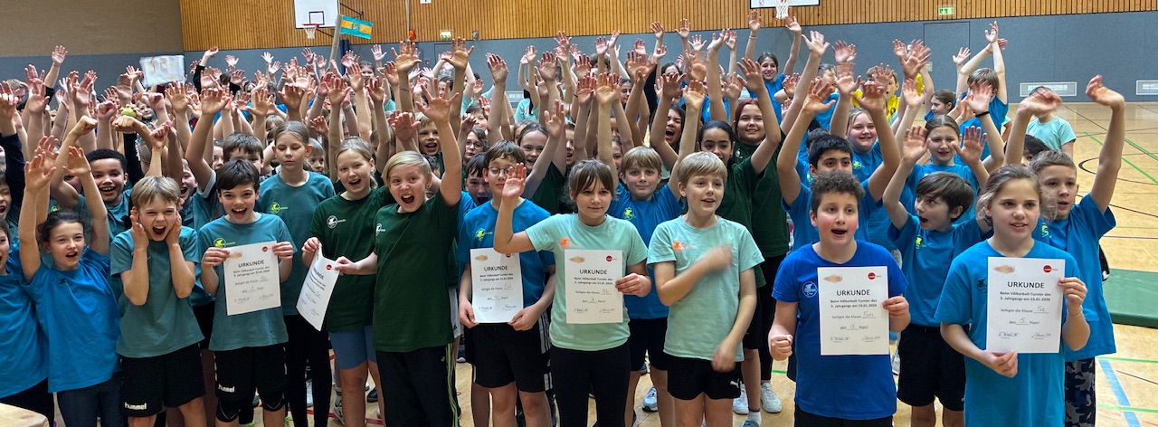 Stellt euch vor, ihr kommt in eine Sporthalle voller Energie: Rund 150 Fünftklässlerinnen und Fünftklässler wuseln durcheinander, es wird gelacht, die Bälle fliegen durch die Luft, Gute-Laune-Musik spielt im Hintergrund und lautstarkes Anfeuern sorgt für eine mitreißende Turnierstimmung. Genau so war es am 23. Januar 2026 in unserer Halle. Hach, das war aufregend!