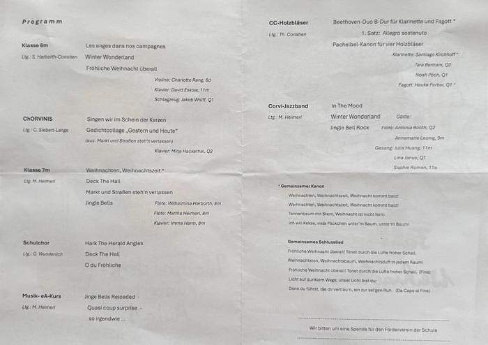 Die m-Klassen, der Musik-Leistungskurs, die Chöre, Jazzband und Holzbläser der CC boten auf den diesjährigen Weihnachtskonzerten ein abwechslungsreiches Programm mit zahlreichen Überraschungen. Alles mündete in den Wunsch: "Fröhliche Weichnacht überall!"