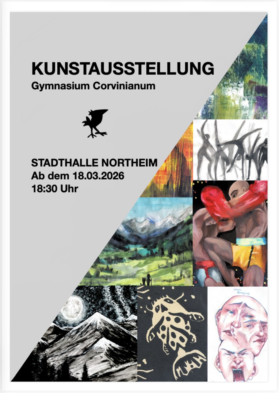 Am 18. März 2026 um 18:30 Uhr wird parallel zu den musikalischen Abenden eine Kunstausstellung unserer gesamten Schule in der Stadthalle in Northeim stattfinden. Wie jedes Jahr werden kreative Arbeiten aller Jahrgänge des Corvis präsentiert. Kuratiert wird die Ausstellung von dem Kunstleisungskurs der diesjährigen Q1 und ihrer Kursleitung, die mit viel Engagement einen abwechslungsreichen Rundgang vorbereiten. Die Eröffnung findet unmittelbar vor dem ersten musikalischen Abend des Schuljahres statt und bietet den Besucher*innen einen stimmungsvollen Auftakt zu einem Abend voller Kunst und Kultur.