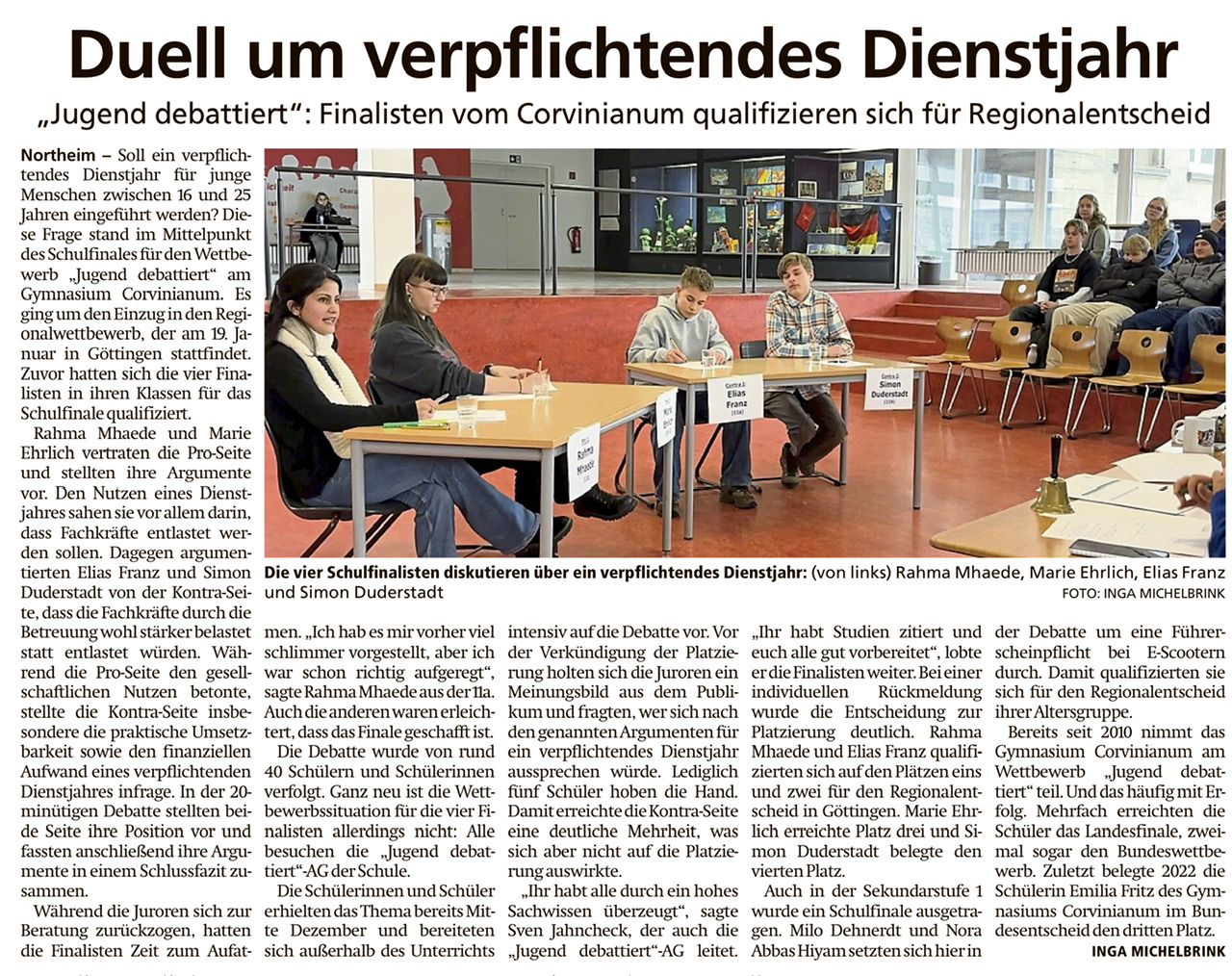 Die Jury, bestehend aus Henning Winalke, Schulkoordinator Sven Jahnscheck, Marius Wehe sowie dem Fünftplatzierten der Schulqualifikation Hannes Möslein (8c), meldete anschließend zurück, dass die eigentliche Maßnahme noch stärker hätte ausgeführt werden können, es aber eine enge Debatte zwischen Pro und Kontra gewesen sei. Sie sah letztlich den Debattanten auf der Position Kontra 2, Milo Dehnerdt (10a), auf dem ersten Platz und die Debattantin auf der Position Pro 2, Nora Abbas Hiyam (9b), auf dem zweiten Platz. Beide werden das Corvi am 19. Januar 2026 beim durch das Felix-Klein-Gymnasium Göttingen veranstalteten Regionalentscheid vertreten. Auf den weiteren Plätzen folgten Felix Breckle (8a, 3. Platz, Position Kontra 1) und Friedrich Richter (8d, 4. Platz, Position Pro 2).