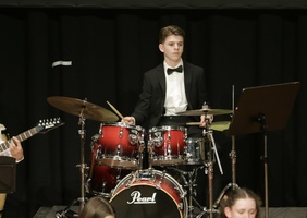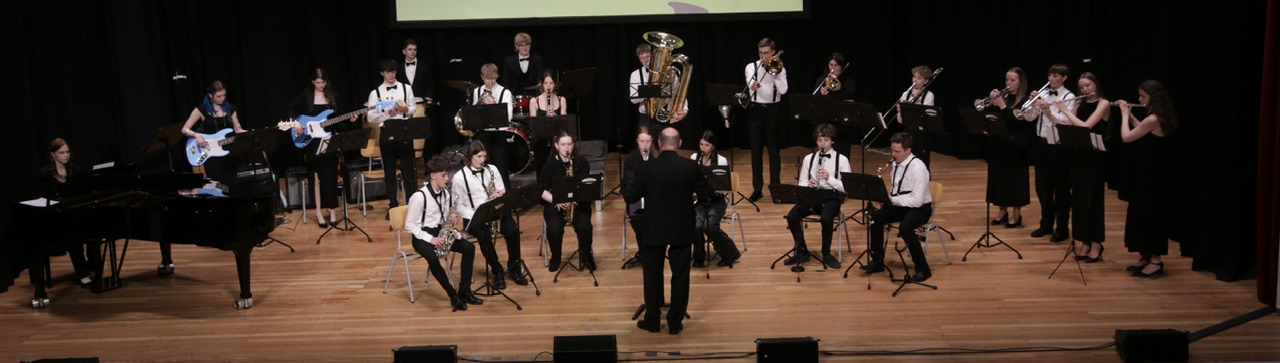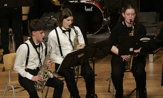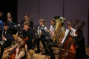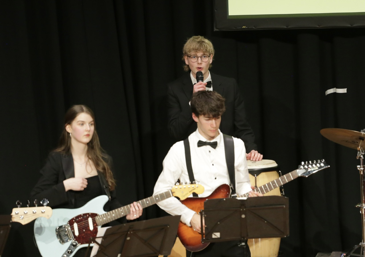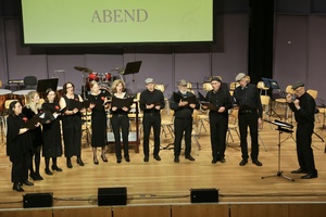 Die Jazzband unter der Leitung von Mirko Heimerl eröffnete den Abend gutgelaunt mit dynamischen Big-Band-Klängen. Santiago Kirchhoff an der Klarinette und Timo Krohn an der Posaune sorgten mit ihren ausgedehnten perlenden Soloeinlagen für besonders starken Szenenapplaus. Eine rhythmische Kostbarkeit bot die Jazzband zum Abschluss, als ganz neue Klänge mit einem Funk-Arrangement des Beatles-Klassikers Lady Madonna zu hören waren.