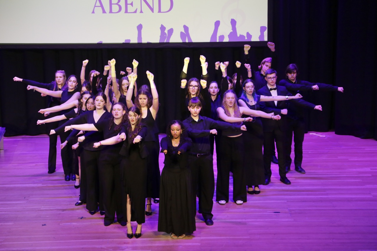 Einen musikalischen und unterhaltsamen Einstieg in den zweiten Teil des Abends bot der Chor der Lehrkräfte. Thomas Constien gab den Chorleiter, der sich selbst immer wieder zu Operneinlagen hinreißen ließ. Er nahm seine Mitsänger:innen –starkes Solo: Doortje Hundt – mit auf eine opereske musikalische Reise.