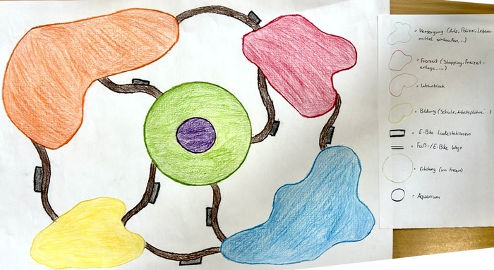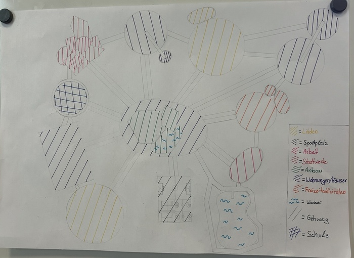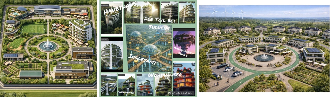 Nachdem alle ihre Karte gezeichnet hatten, haben wir unsere Vorstellungen mithilfe von KI dargestellt. Es war relativ schwer, der KI genau zu sagen, wie unsere nachhaltige Stadt aussehen soll, aber am Ende sind wir alle zu kreativen Ergebnissen gekommen, die wir dann in der Klasse vorgestellt haben.