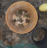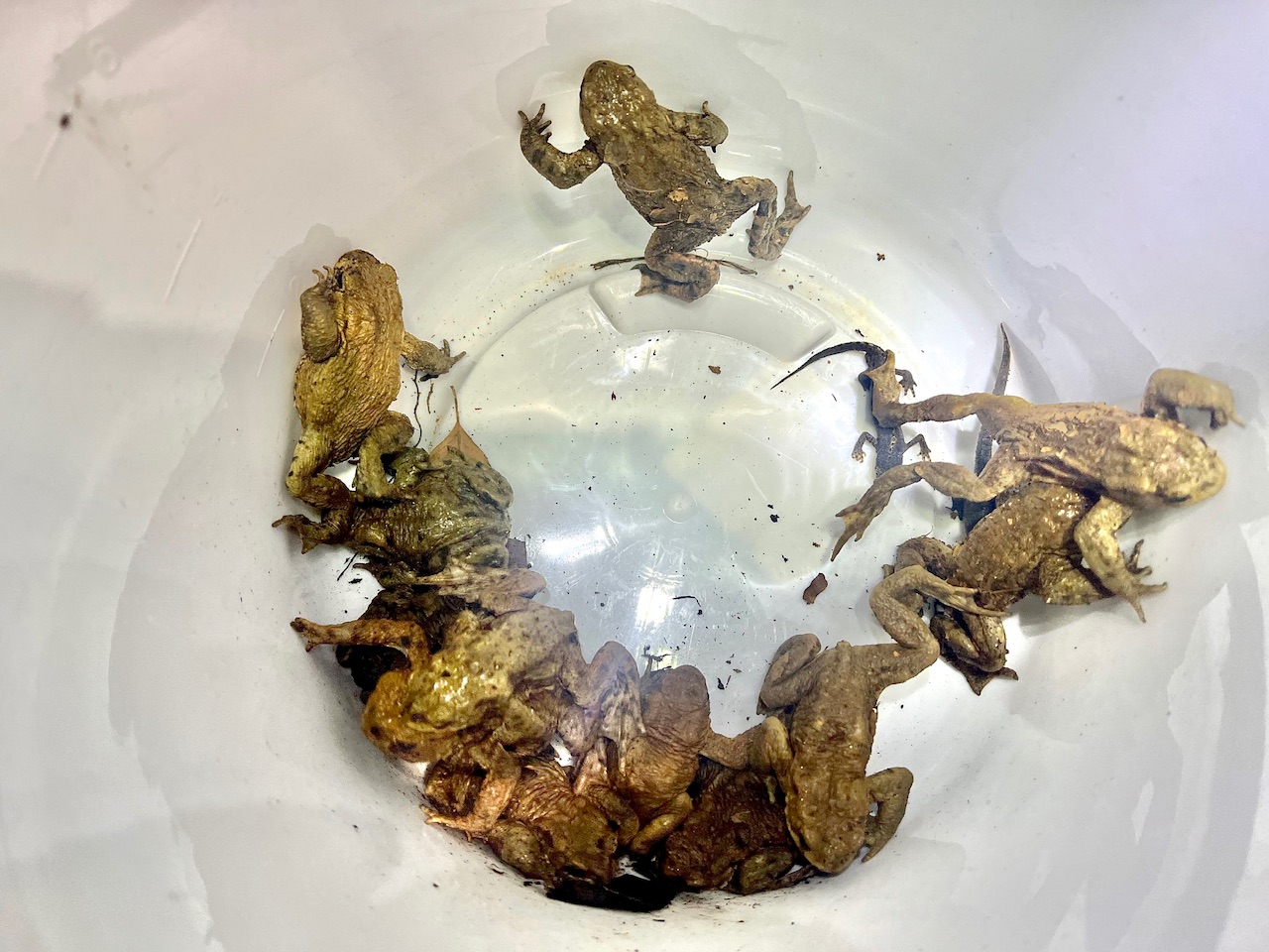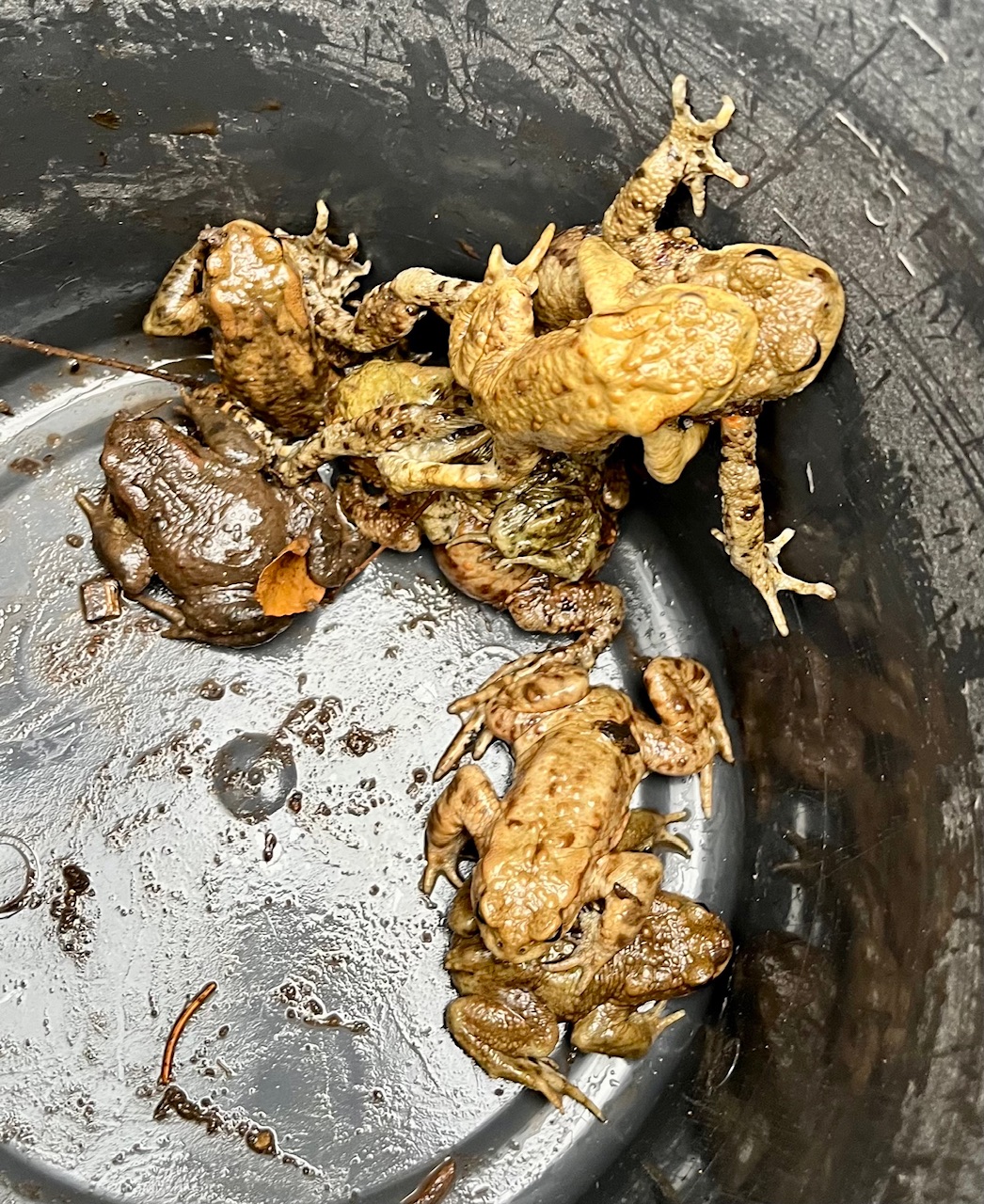 Da heute niemand eingetragen war, sind wir noch einmal losgezogen und haben drei weibliche, 16 männliche Kröten und vier Doppeldecker gefunden. Zudem waren drei Grasfrösche, ein Braunfrosch und zwei Molche in den Eimern. Einige Tiere waren zwar auf der Teichseite, da es aber ein Doppeldecker und zwei ziemliche dicke Weibchen waren, sind wir davon ausgegangen, dass das Ablegen der Eier da noch nicht passiert ist. Deshalb haben wir alle zum Teich gesetzt.