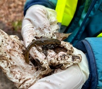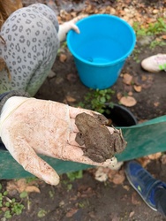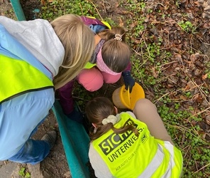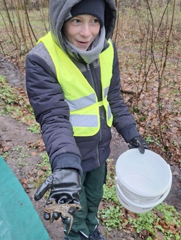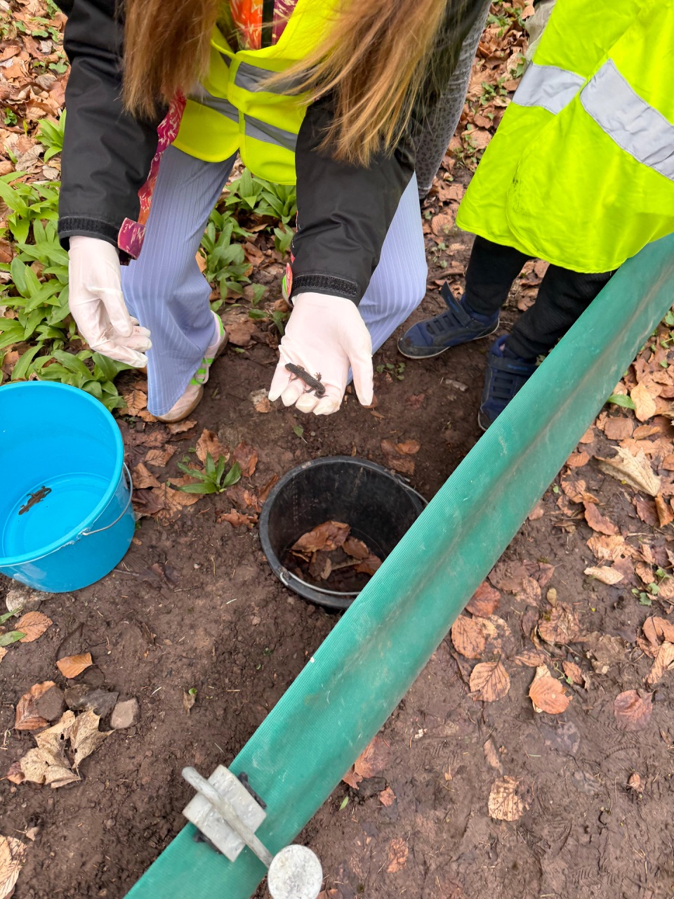 Erstmals als Team dabei: Elisa und Mats aus der Klasse 5m. Mit dabei: Elisas Schwester Karina. Die drei waren spontan zu einem Sondereinsatz außerhalb der Terminbuchung bereit, als sie hörten, dass der Zaun bereits steht und daher sofort Naturschützer:innen benötigt werden. Ihr Einsatz: Ein voller Erfolg. Sie fanden drei Erdkrötenweibchen, acht Männchen und sage und schreibe 18 Molche in den Auffangeimern auf der Hangseite. Die Witterung war trocken, die Temperatur betrug am Samstagmorgen 6°C.
