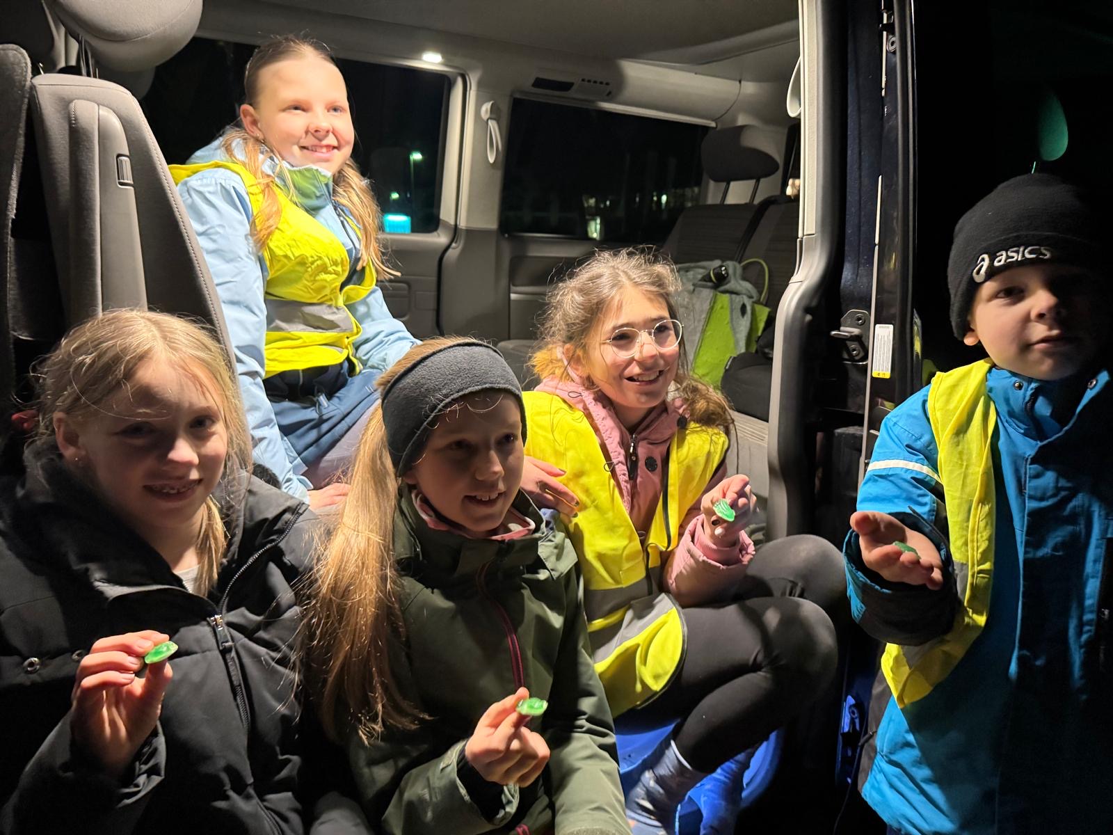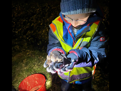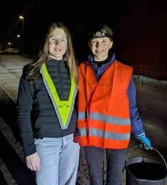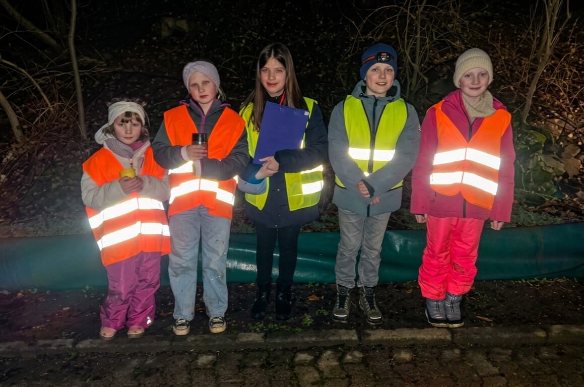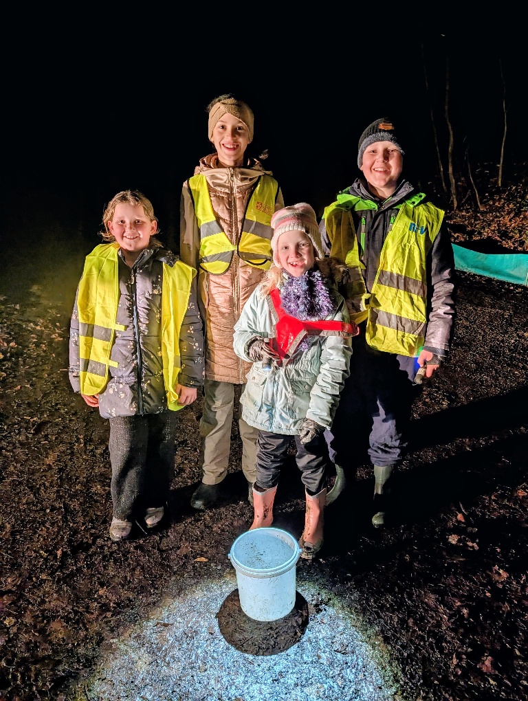 Bei Nieselregen machten sich Tom und Lara aus der 6b mit Toms Schwestern Emily 2a und Charlotte 3a auf den Weg. Die Kröten schienen das Wetter mehr zu mögen als wir. Wir haben 28 Männchen, 3 Doppeldecker und 6 Molche gefunden. Die Kids sammelten fleißig alle Tierchen ein und halfen ihnen bei ihrer Reise. Die beiden Großen erklärten den beiden Grundschülerinnen alles geduldig und ausführlich. Alle Vier waren mit Freude bei der Sache. Es war eine spannende, regnerische Nachtwanderung.