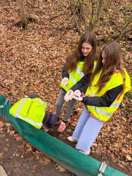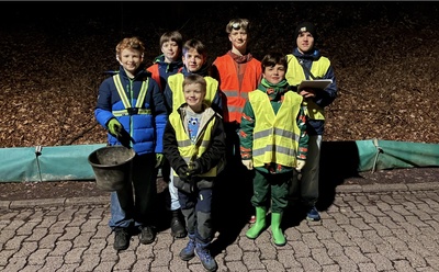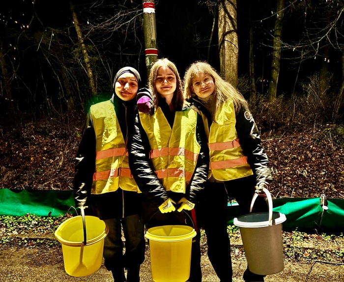 Freitagabend waren zwei Teams am Start: Zunächst fanden Emilia Wolter, Florentine Harborth und Magdalena Siebert aus der 5m sowie Wilhelmina Harborth aus der 8m bei 11°C und feuchter Witterung 44 Erdkröten auf der Hin- und zwei Amphibien auf der Rückwanderung. Anschließend fand Matteo Wolff zwei Männchen und einen Molch auf der Hinwanderung sowie ein Weibchen auf der Rückwanderung. Am Samstagmorgen fand Projektleiter Wolff 10 Amphibien auf der Hinwanderung, darunter zwei Doppeldecker, sowie zwei Männchen auf der Rückwanderung bei 10°C und feuchter Witterung.