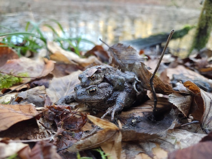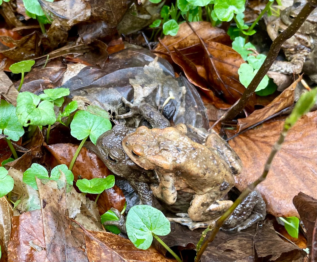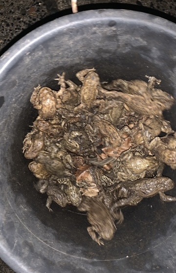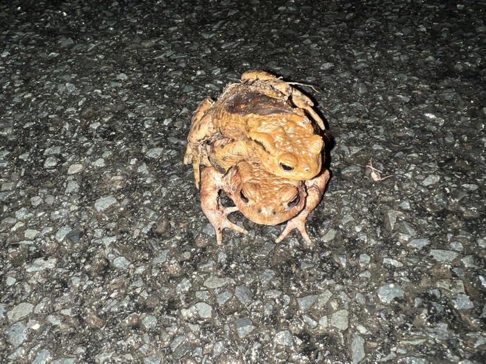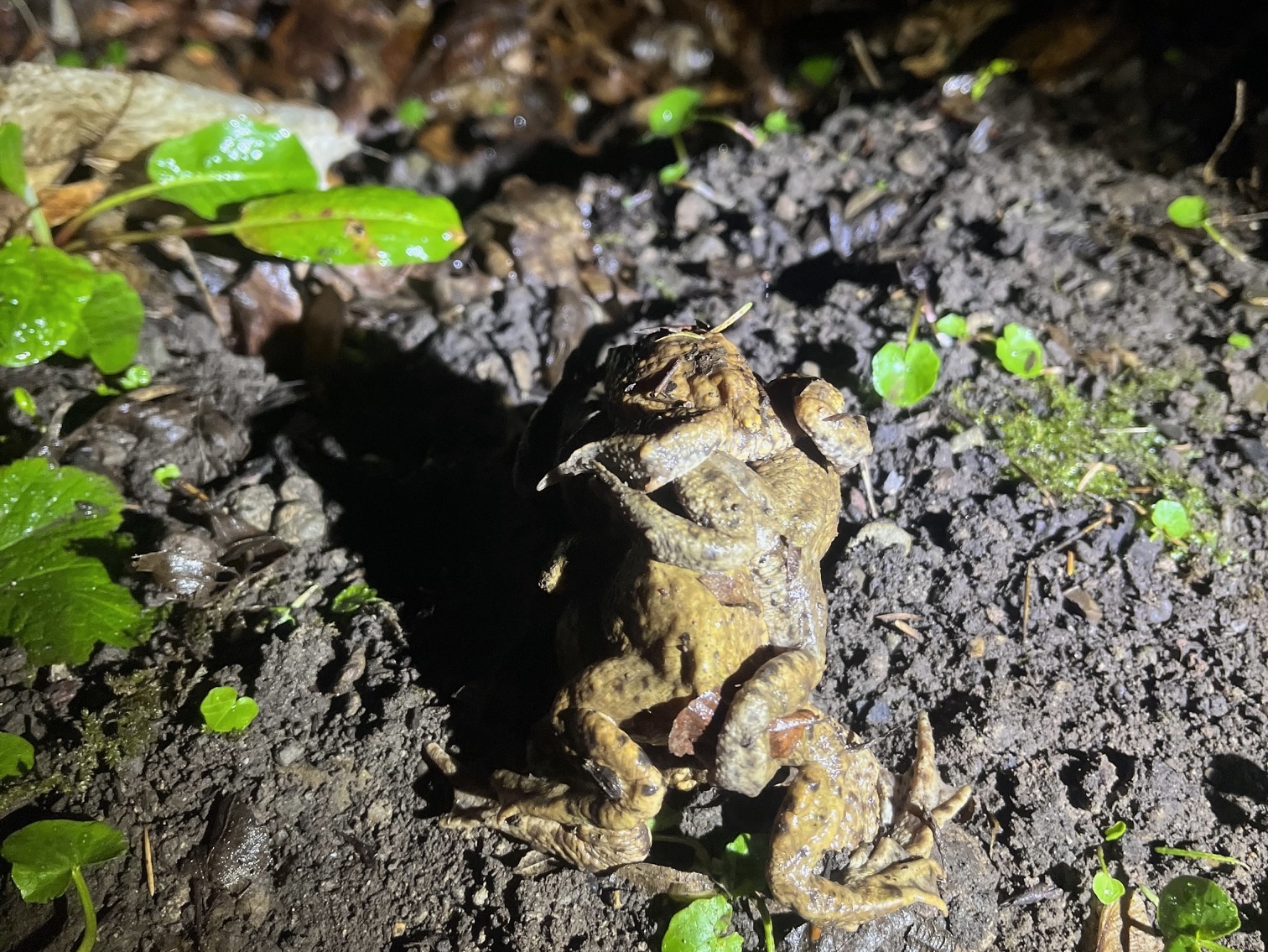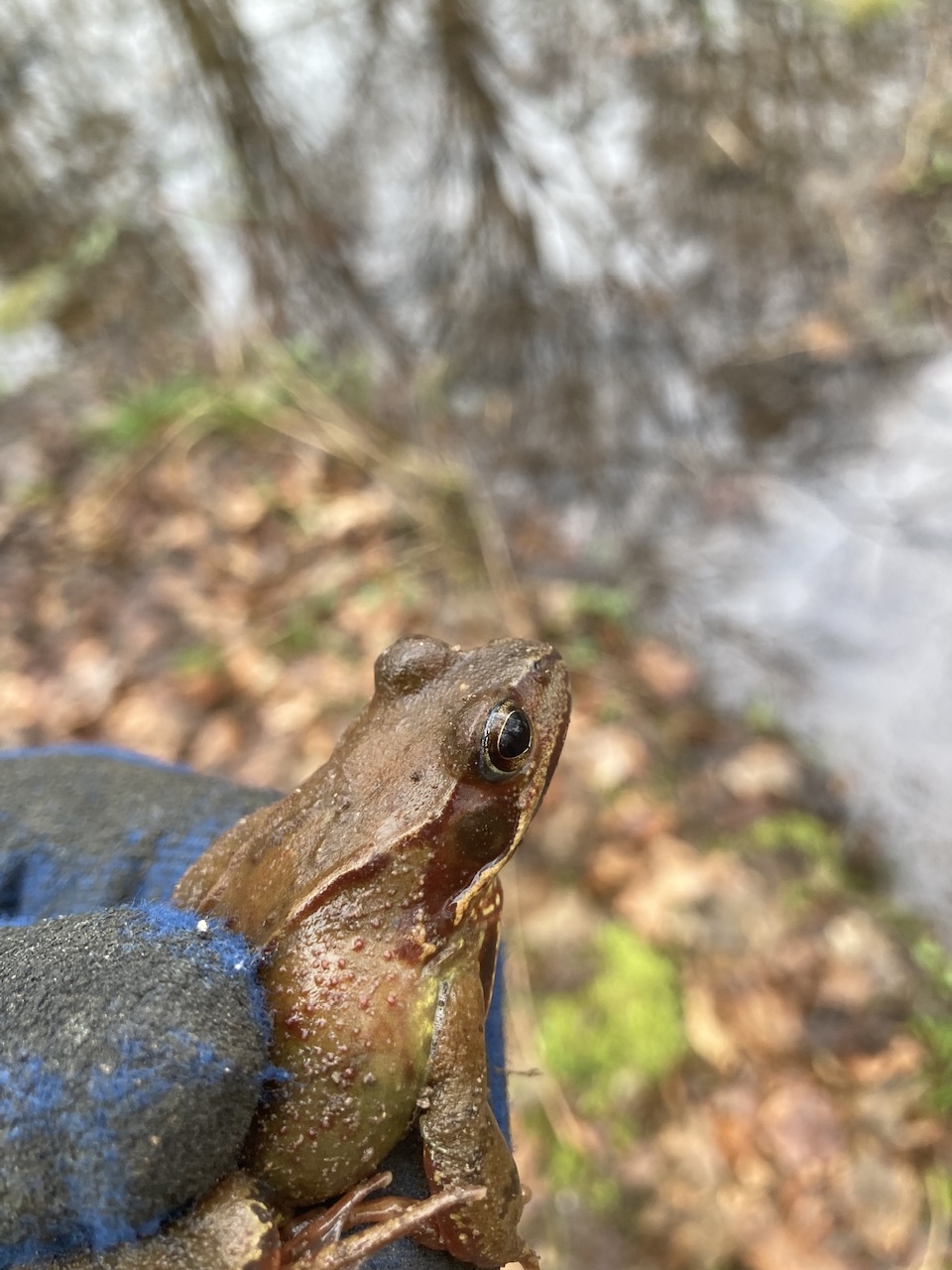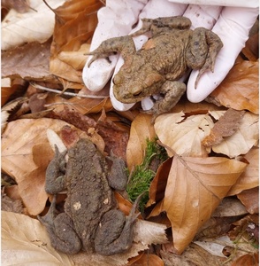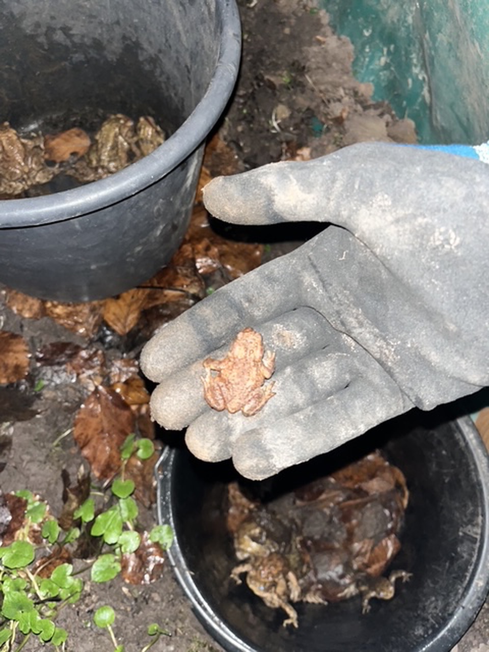 Unpassend zum Weltfrauentag haben wir überwiegend männlichen Kröten helfen können. Bei 8 Grad und trockenem Wetter konnten wir die meisten Kröten auf der Hinwanderung auffinden. 43 männliche Kröten, ein Doppeldecker und 2 Molche waren dort unterwegs. Auf der Rückwanderung war bis jetzt nur eine männliche Kröte, ein Molch und (wir vermuten) ein Braunfrosch. Dieser hatte ein ganz anderes Aussehen als die anderen Kröten und war auch viel aktiver (siehe Foto rechts/unten).