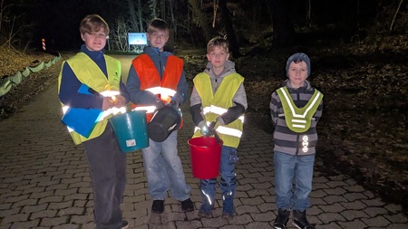 Die Familien Westermann und Kellner fanden am Samstagmorgen bei kalten 4°C und feuchter Witterung 52 Amphibien auf der Hin- und 66 Amphibien auf der Rückwanderung.