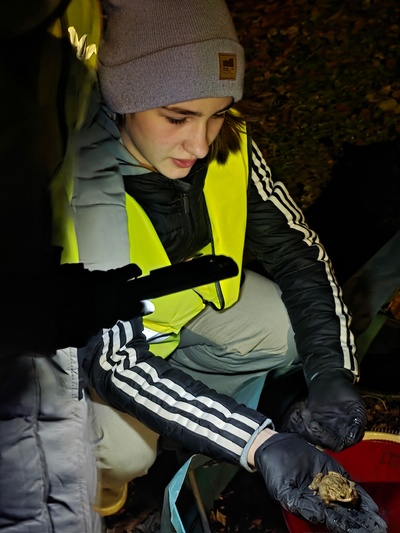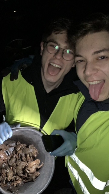 Regen sorgte am Mittwochabend dafür, dass Julius und Anton aus dem Jahrgang 12/Q1 alle Hände voll zu tun hatten. Sie sammelten insgesamt 199 Tiere auf der Hin- und 31 auf der Rückwanderung bei 9°C und nasser Witterung. Die Beharrlichkeit hat sich für Julius ausgezahlt, denn er weiß aus den letzten Jahren, wie es ist, wenn die Kröten nicht wandern.