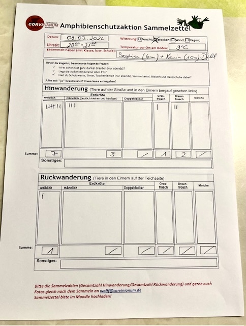 Am Donnerstagmorgen fand Greta Hermsen aus der 8d 1 Amphib auf der Hin- und 5 Amphibien auf der Rückwanderung und das bei 5°C und trocken-windiger Witterung. Greta beteiligt sich seit mindestens sieben Jahren regelmäßig am Amphibienschutzprojekt und gehört damit zu den erfahrensten Stützen des Corvi-Naturschutzprojekts. Ebenso wie ihr Bruder Julius, der in diesem Jahr zu den Teams in der krötenreichsten Nacht am 11. März gehörte. Kompliment!