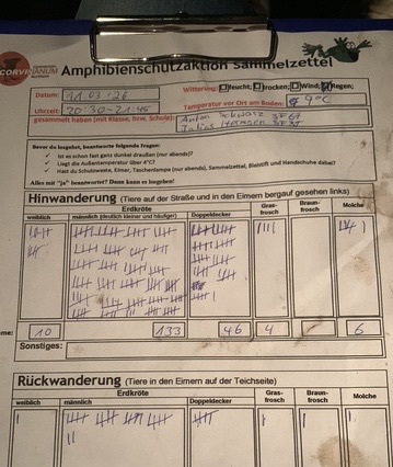 Über den Sonntagabend schreibt Elisa Reinhardt aus der 5m: "Anbei die Sammelzahlen unserer heutigen Sammelaktion. Leider hatten wir heute nicht so viel zu tun wie beim letzten Mal." Elisa fand bei 3°C und trockener Witterung zwei Molche auf der Hin- sowie ein Erdkrötenmännchen auf der Rückwanderung.