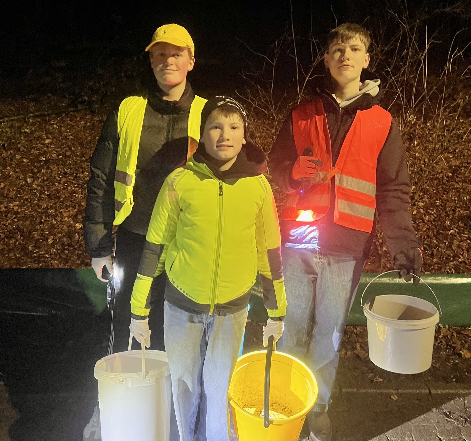 Nachdem wir im letzten Jahr gar nicht erfolgreich waren, konnten wir, Felix Löhr und William Kreitz aus der 9m und Anton Löhr aus der 6b, heute bei 10 Grad und leichtem Regen vielen Tieren beim Wechseln der Straßenseite helfen.