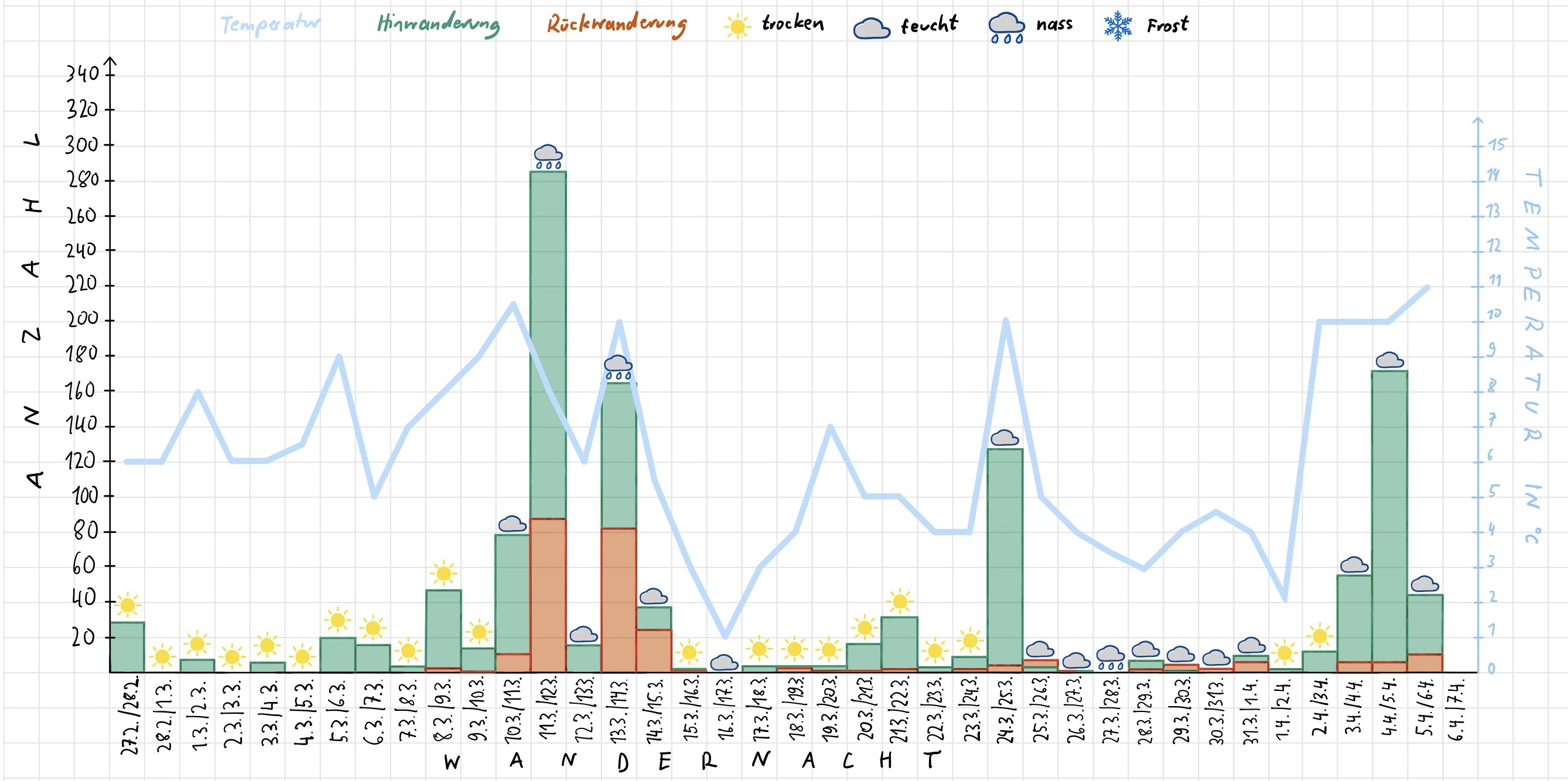 Die erste Wanderwoche zeigte, dass bei trockener Witterung und kalten Nächten nicht viele Amphibien wandern. Zur Mitte der zweiten Wanderwoche wurde die Witterung feucht und regnerisch. Sofort nahmen die Wanderbewegungen erheblich zu. Die dritte Wanderwoche verlief wieder deutlich ruhiger. In der vierten Wanderwoche gab es eine weitere krötenreiche, warme und regnerische Nacht. Da die Zäune vor Ostern nicht mehr abgebaut werden konnten, läuft die Aktion über Ostern weiter. In der Nacht zum Ostersonntag kam es zum Ende der Aktion hin dann zu einer weiteren Massenwanderung.