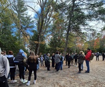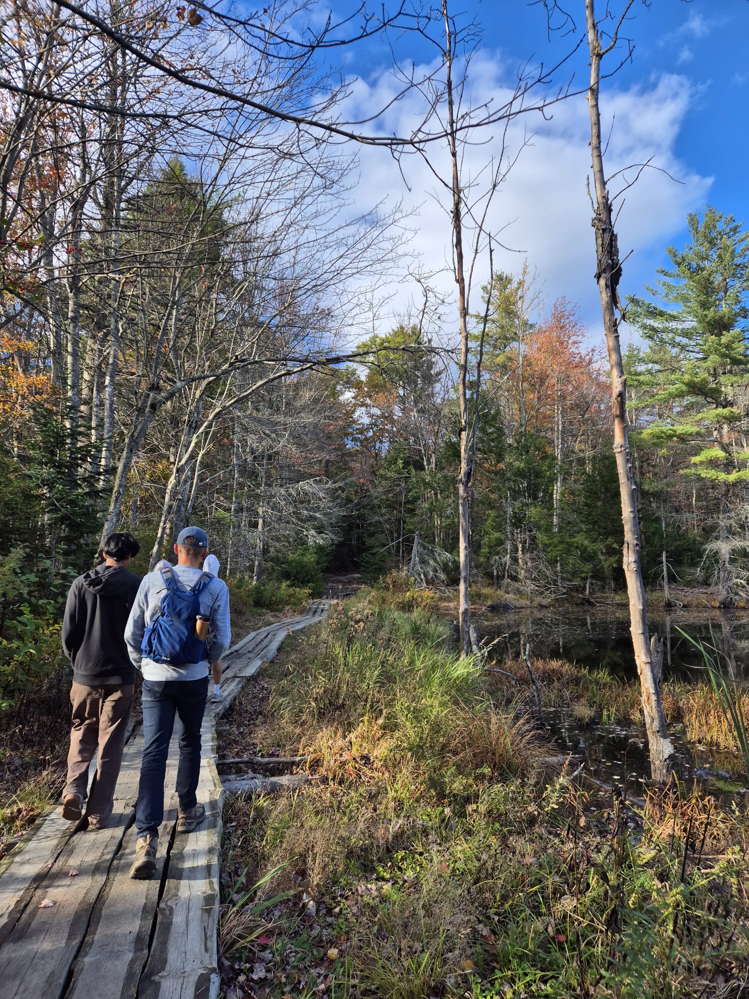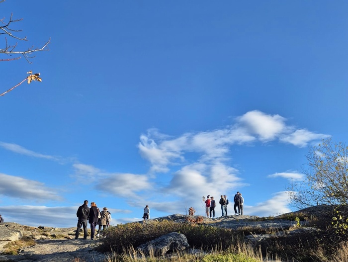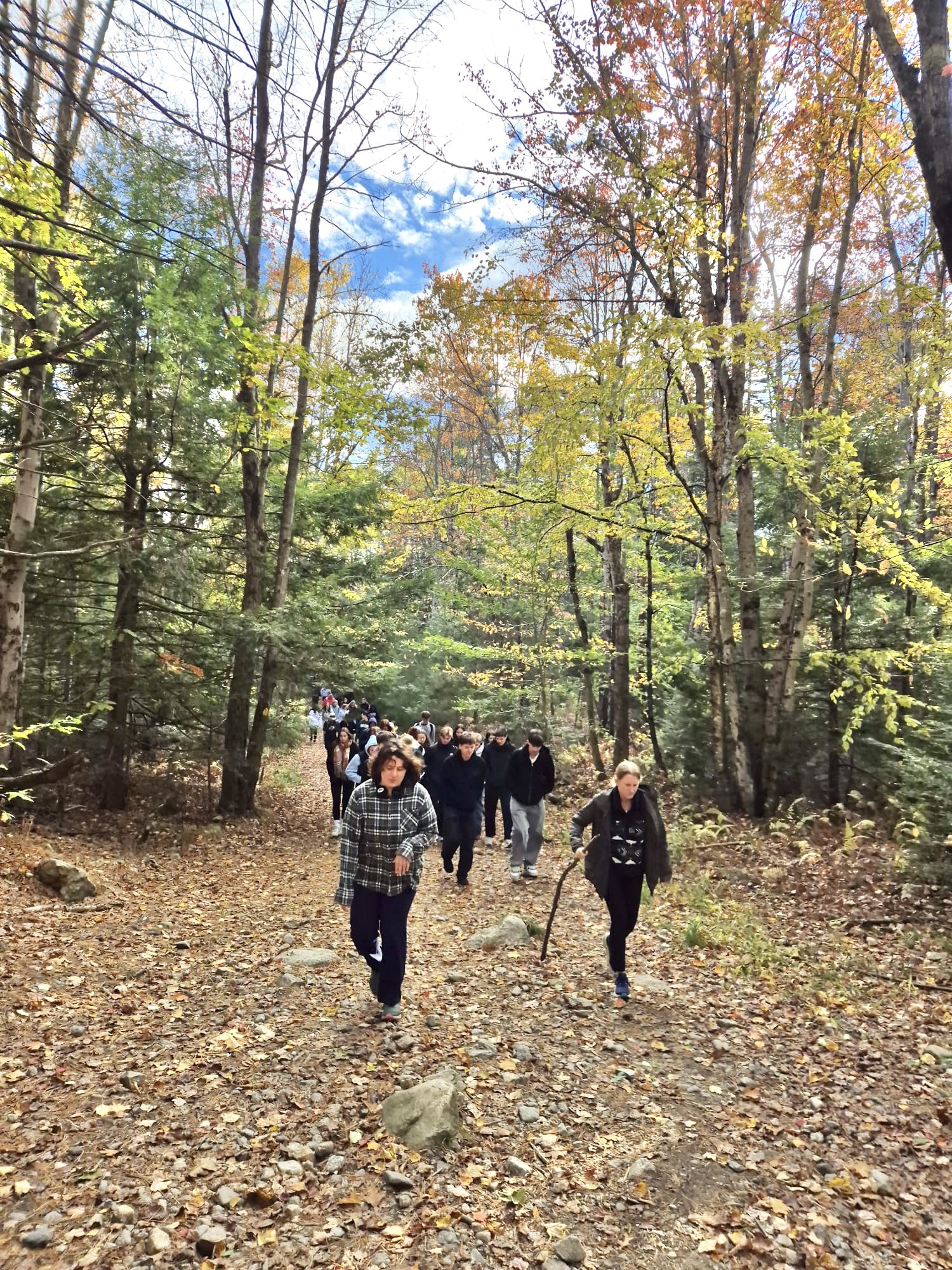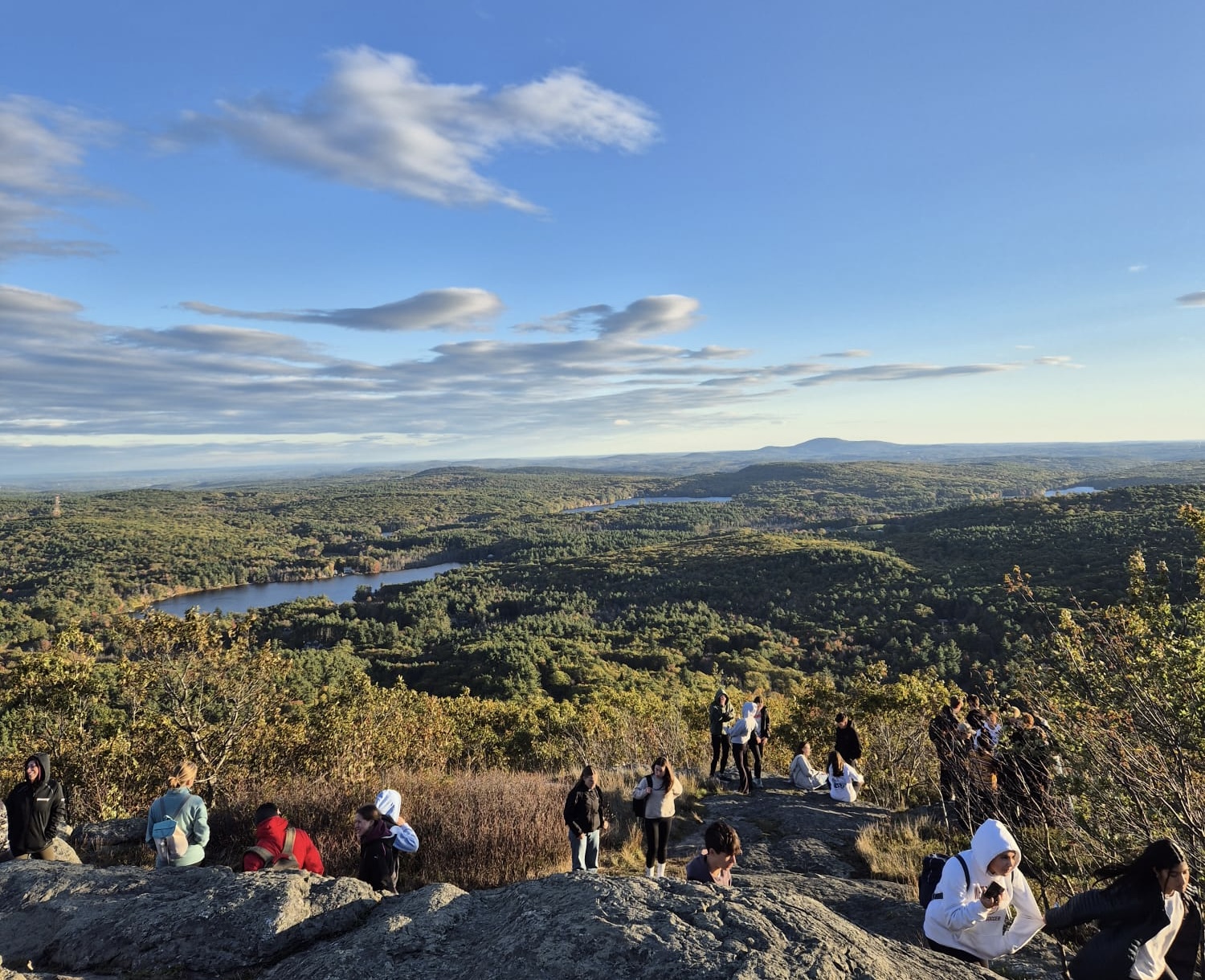 After school came the main event of the day: our hike up Mount Watatic! We didn’t take a bus this time — instead, we split into small car groups and drove there ourselves. The drive was already nice, with trees glowing in all different autumn colors. The hike itself was a bit exhausting, but the atmosphere made it worth it. Everyone was chatting, laughing, and taking tons of photos. The forest smelled like fall, and when we reached the top, the view was incredible — endless trees and a clear blue sky.