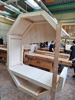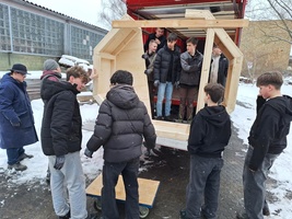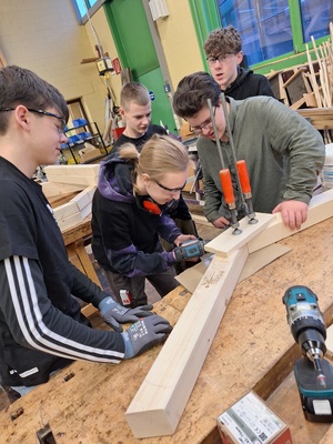 Angeleitet von Hausmeister Ralf Timpner und Lehrer Ollo Wode sowie den Zimmerermeistern Michael Brüggemann und Ulrich Hoinkhaus werden Balken und Platten gesägt, gebohrt, geleimt und geschraubt was das Zeug hält - mehr noch: DASS das Zeug hält ;-) Die vier Betreuer geben ihre Begeisterung für den Werkstoff Holz und dessen Bearbeitung weiter und der Funke springt sofort über!
