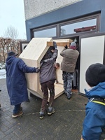 Erstmal mussten wir die schweren, großen Holzplatten aus dem Lager in die Werkstatt schaffen. Dann haben wir uns in Gruppen aufgeteilt und an verschiedenen Sägemaschinen die Platten auf Maß geschnitten. Das macht viel Spaß!!!