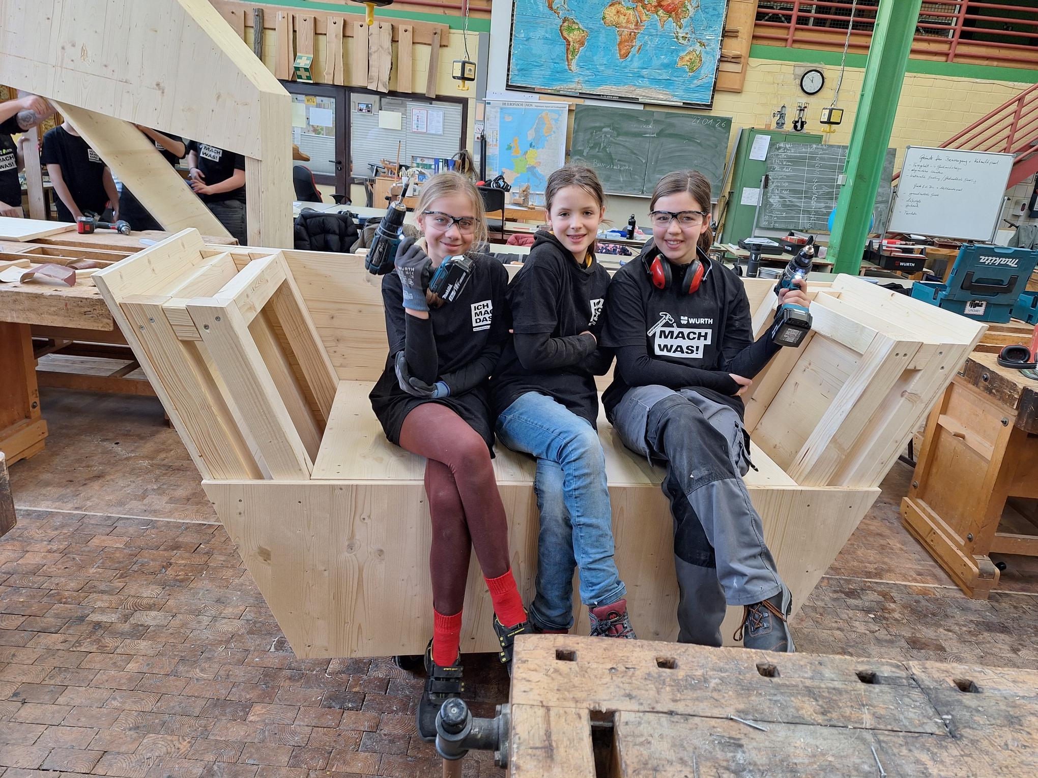 Alle SchülerInnen? NEIN! Eine kleine Schar unerschrockener Kids aus dem Jahrgang 8 stellt sich der Herausforderung HANDWERK und schwingt Säge und Akkuschrauber!!!