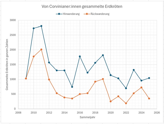 Direkt nach dem Sammeln eine E-Mail an wolff@corvinianum.de mit der Anzahl der Kröten / fotografiertem Sammelzettel und den Namen aller tatsächlichen Helfer*innen senden und den Sammelzettel im Abgabemodul für Sammelzettel hochladen. Das ist besonders WICHTIG, denn diese Informationen werden vom Landkreis sehr genau wissenschaftlich ausgewertet und für alle späteren Maßnahmen rund um den Gesundbrunnen berücksichtigt!