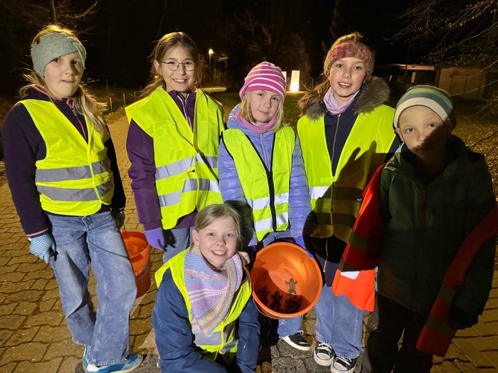 Ein Team aus der Klasse 5d war am 29. März 2025 am Krötenzaun: Silas, Justus, Leif und Aaron fanden ab 8 Uhr bei 8°C und trockener Witterung 42 Amphibien auf der Hin- und 12 auf der Rückwanderung. Das Foto zeigt: Die Vier haben sich mit Freude verantwortungsvoll um die schützenswerten Amphibien gekümmert!