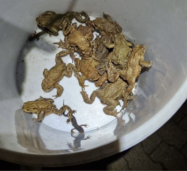 In der Nacht zum Montag fand Projektleiter Wolff bei 8°C und trockener Witterung fünf Molche und ein Erdkrötenmännchen auf der Hinwanderung und setzte zahlreiche Eimer richtig ein.
