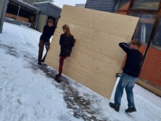 Angeleitet von Hausmeister Ralf Timpner und Lehrer Ollo Wode sowie den Zimmerermeistern Michael Brüggemann und Ulrich Hoinkhaus werden Balken und Platten gesägt, gebohrt, geleimt und geschraubt was das Zeug hält - mehr noch: DASS das Zeug hält ;-) Die vier Betreuer geben ihre Begeisterung für den Werkstoff Holz und dessen Bearbeitung weiter und der Funke springt sofort über!
