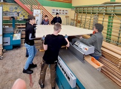 Erstmal mussten wir die schweren, großen Holzplatten aus dem Lager in die Werkstatt schaffen. Dann haben wir uns in Gruppen aufgeteilt und an verschiedenen Sägemaschinen die Platten auf Maß geschnitten. Das macht viel Spaß!!!